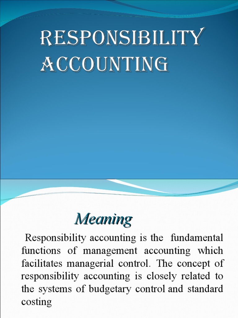 Responsibility Accounting Responsibility accounting as defined by CIMA is a system of accounting that segregates revenue and costs into areas of personal responsibility in order to asses the performance attained by persons to whom authority has been assigned. Each accounting report contains all items allocated to a responsibility center. In other words its a system that is used to gauge how well departments are managing expenses and controlling costs.